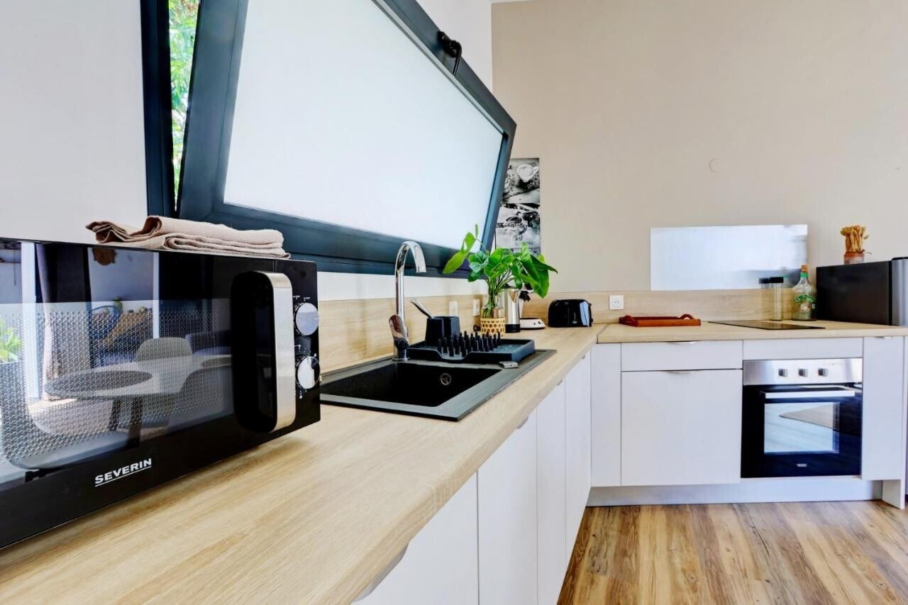 Situé au rez-de-chaussée, cet appartement comprend une chambre, une télévision à écran plat avec des services de streaming ainsi qu'une cuisine entièrement équipée avec un four, un micro-ondes, un lave-linge, un grille-pain et un réfrigérateur.
