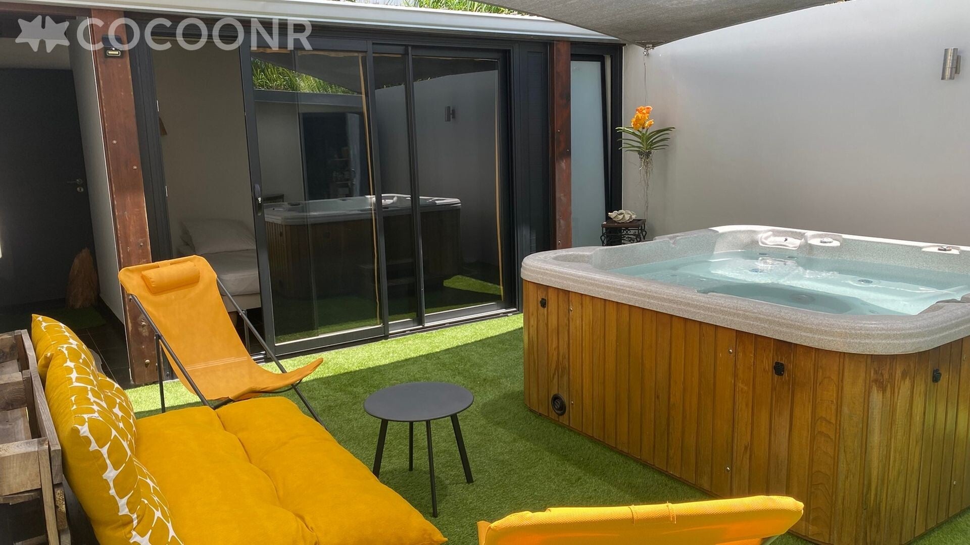 - Un coin spa avec jacuzzi, pouvant accueillir 4 convives, disponible toute l’année sous une voile d'ombrage ainsi qu'une terrasse avec un petit salon.